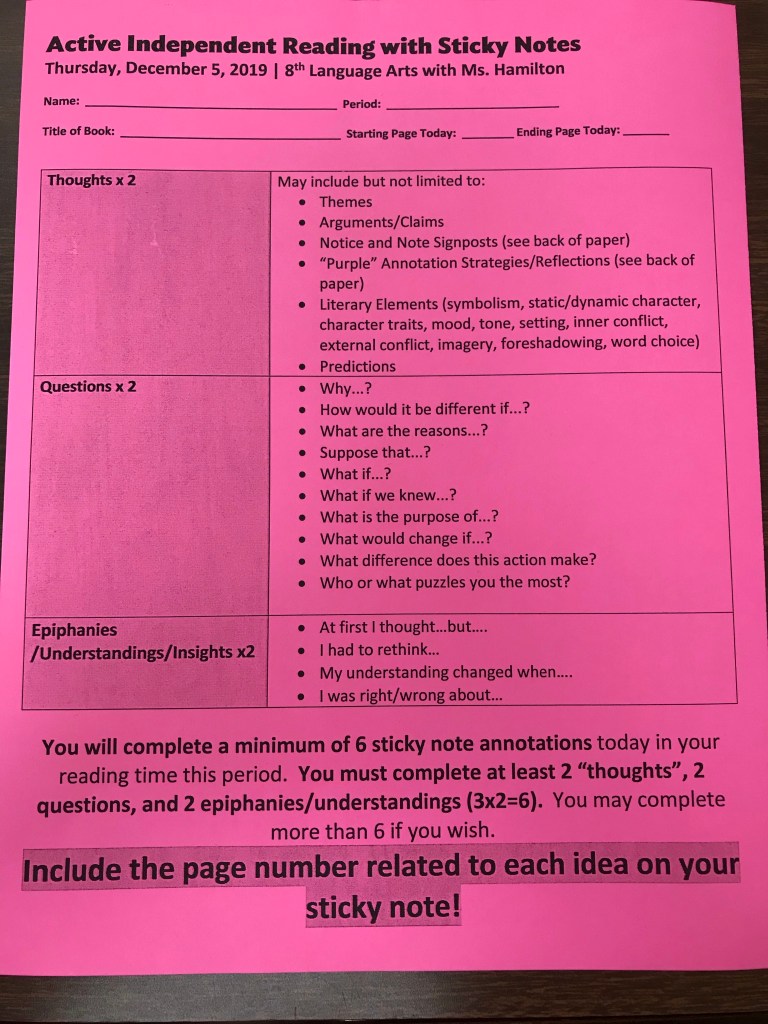Today we worked on Post-It note annotations for our independent reading time. Please see the slideshow and photos below to see what we did. Several students will need to do additional reading time and thinking time to complete their Post-It note annotations, which are due tomorrow at the beginning of class.